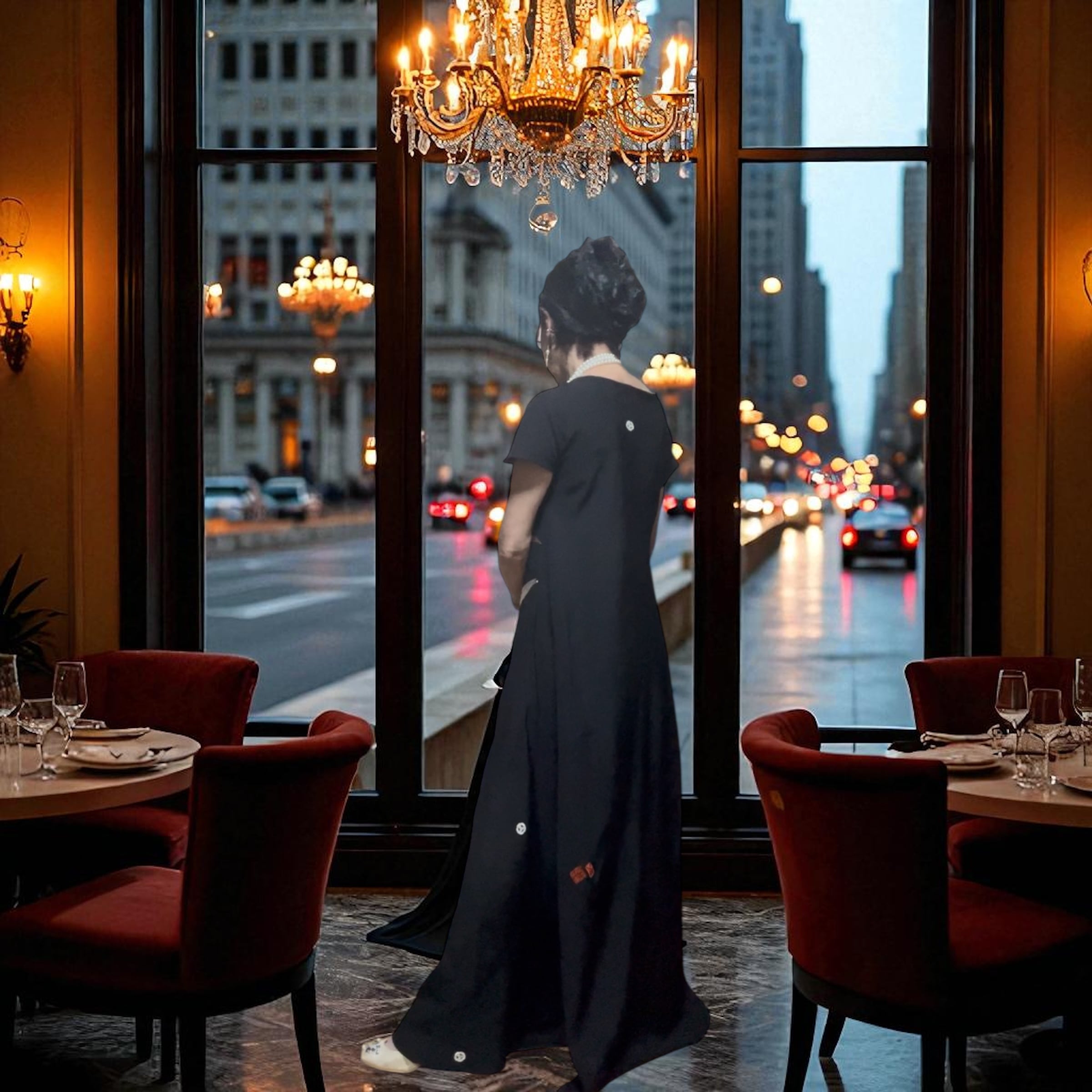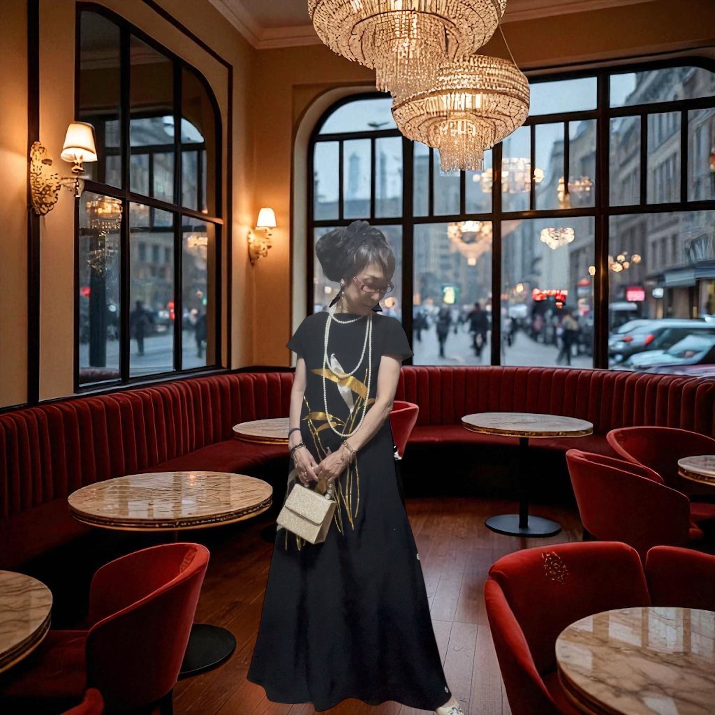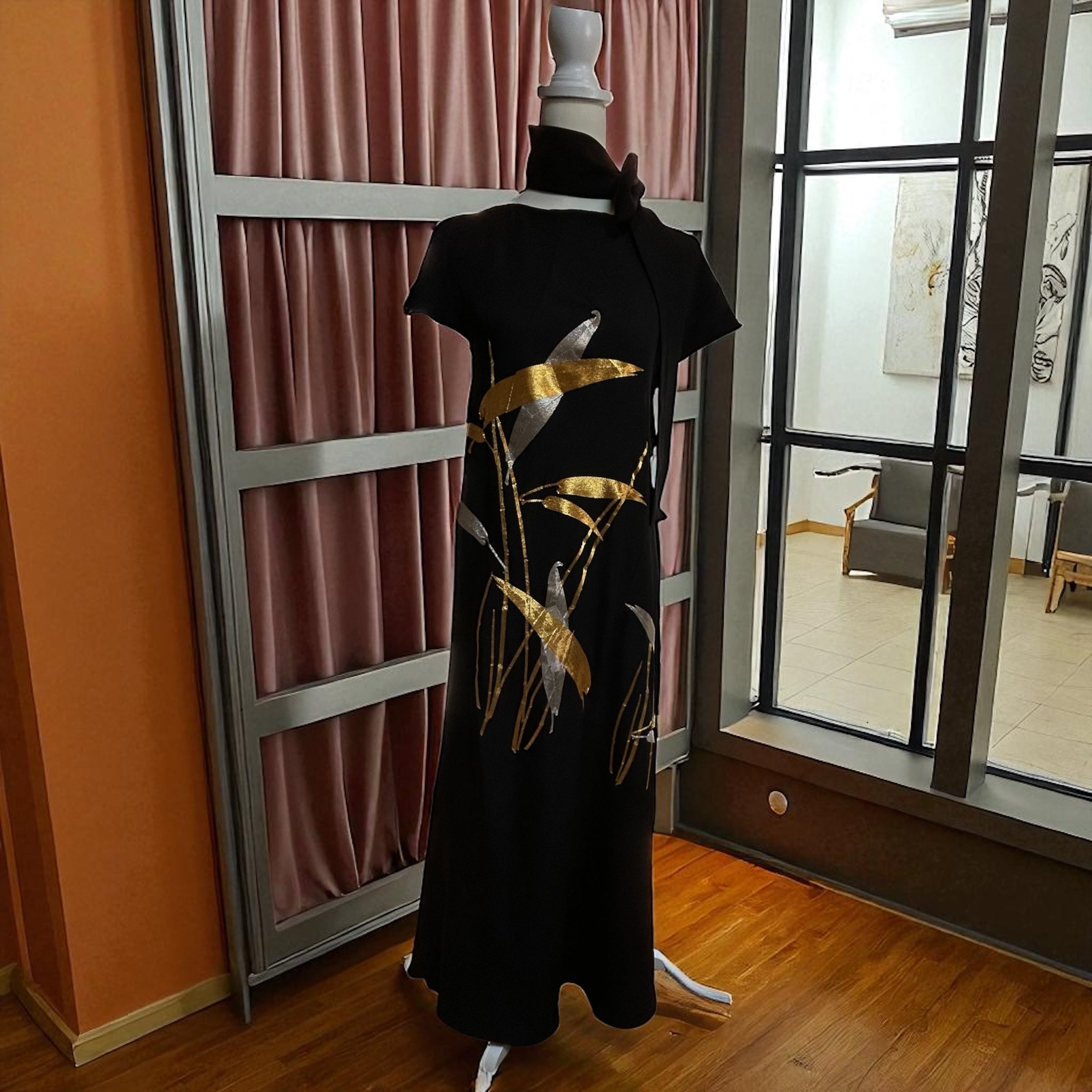 このロングドレスは、厳選された黒留袖素材を利用したオリジナル作品です。施された伝統的な模様が品のある美しさを引き立てるデザインは、現代的なシルエットと見事に調和し、唯一無二の魅力を放っています。日本の文化を体感しながら、自分自身のスタイルを創り上げることができる特別なアイテムです。