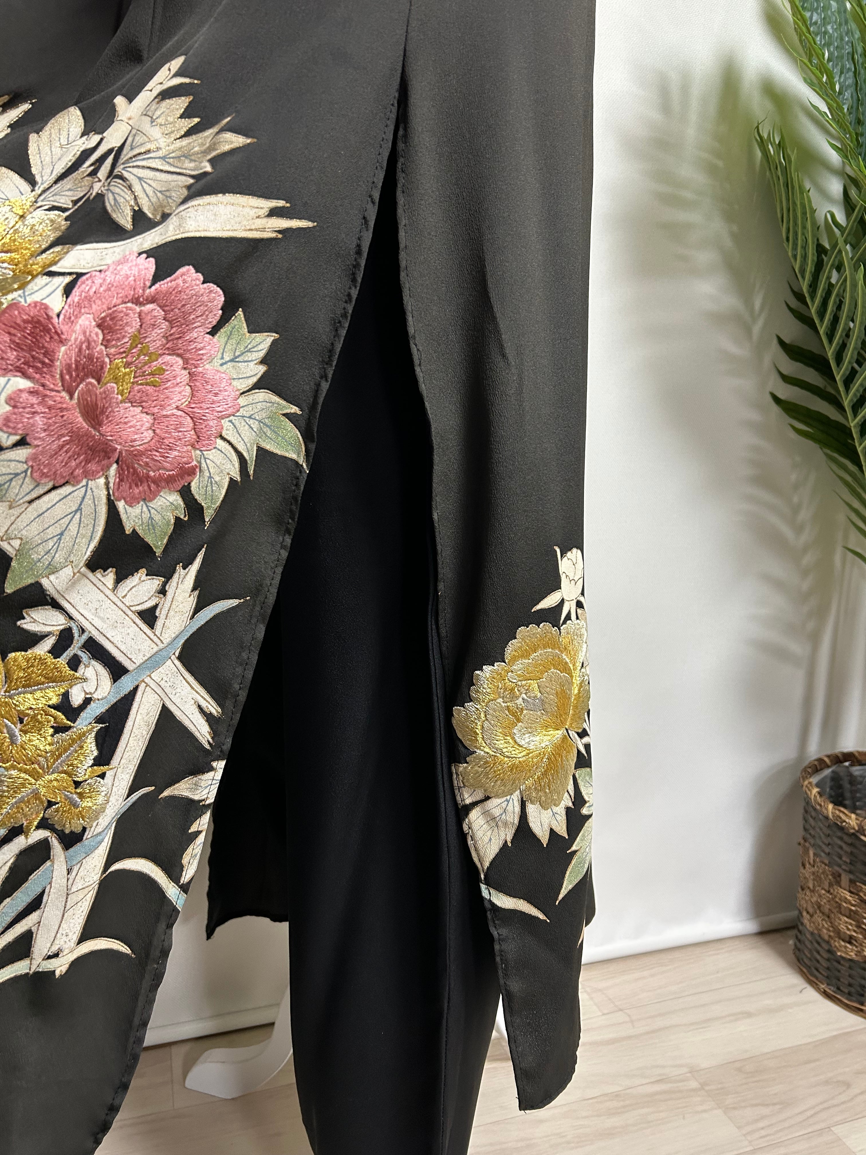 黒留袖をリメイクしたロングジレが登場しました。伝統的な黒留袖の美しさを現代風にアレンジしたこの一着は、上品でありながらも個性的なスタイルを提案します。シックなデザインは、深いスリット両脇に入っていますカジュアルな日常使いにも、特別なシーンにも最適です。