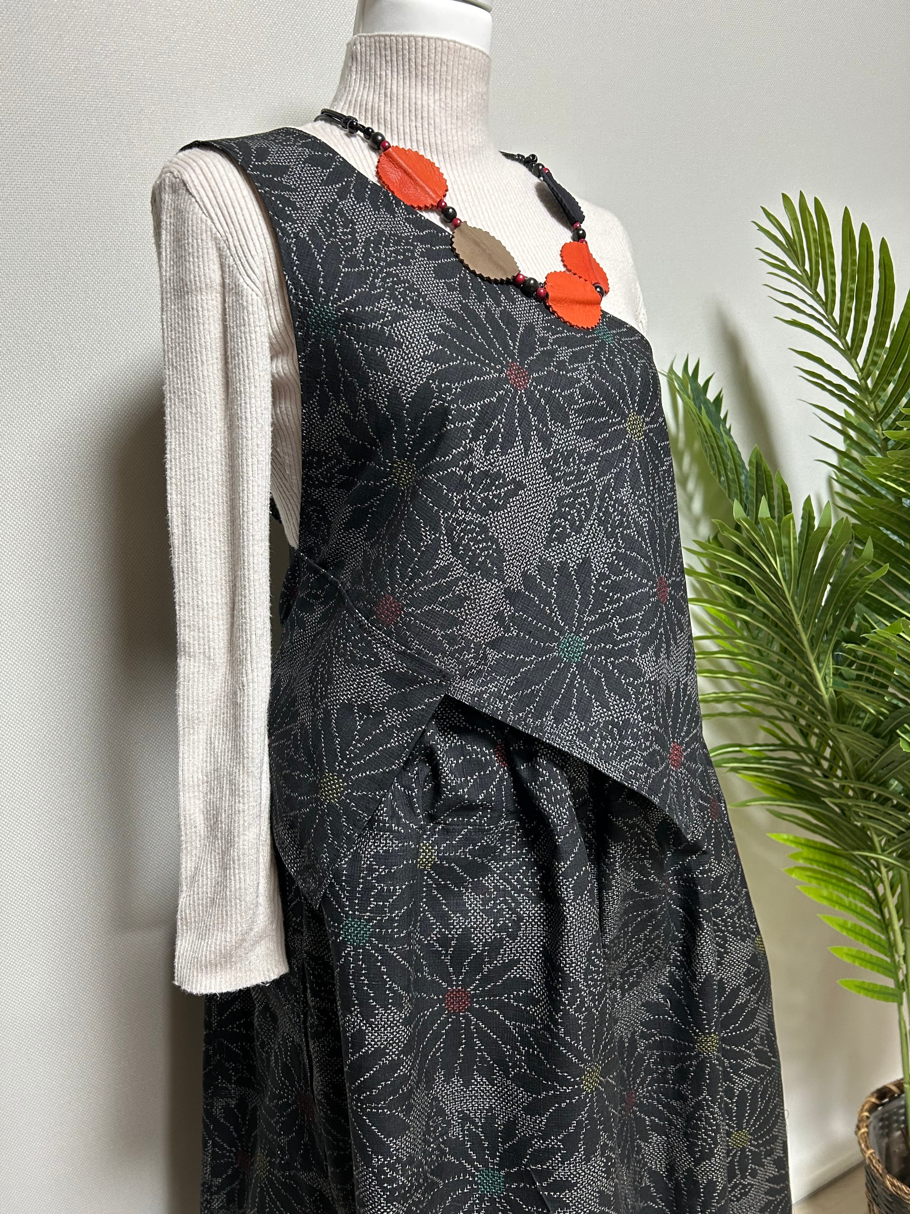 美しい菊柄の紬を使用したアシンメトリーベスト、スカート、パンツの3点セットアップが新登場しました。伝統的な紬の魅力を現代的なデザインで表現したこのコーディネートは、エレガントさと独特の個性を兼ね備えたスタイルを提案します。軽やかで着心地の良いデザインは、特別なお出かけからカジュアルな日常使いまで、幅広いシーンで活躍します!