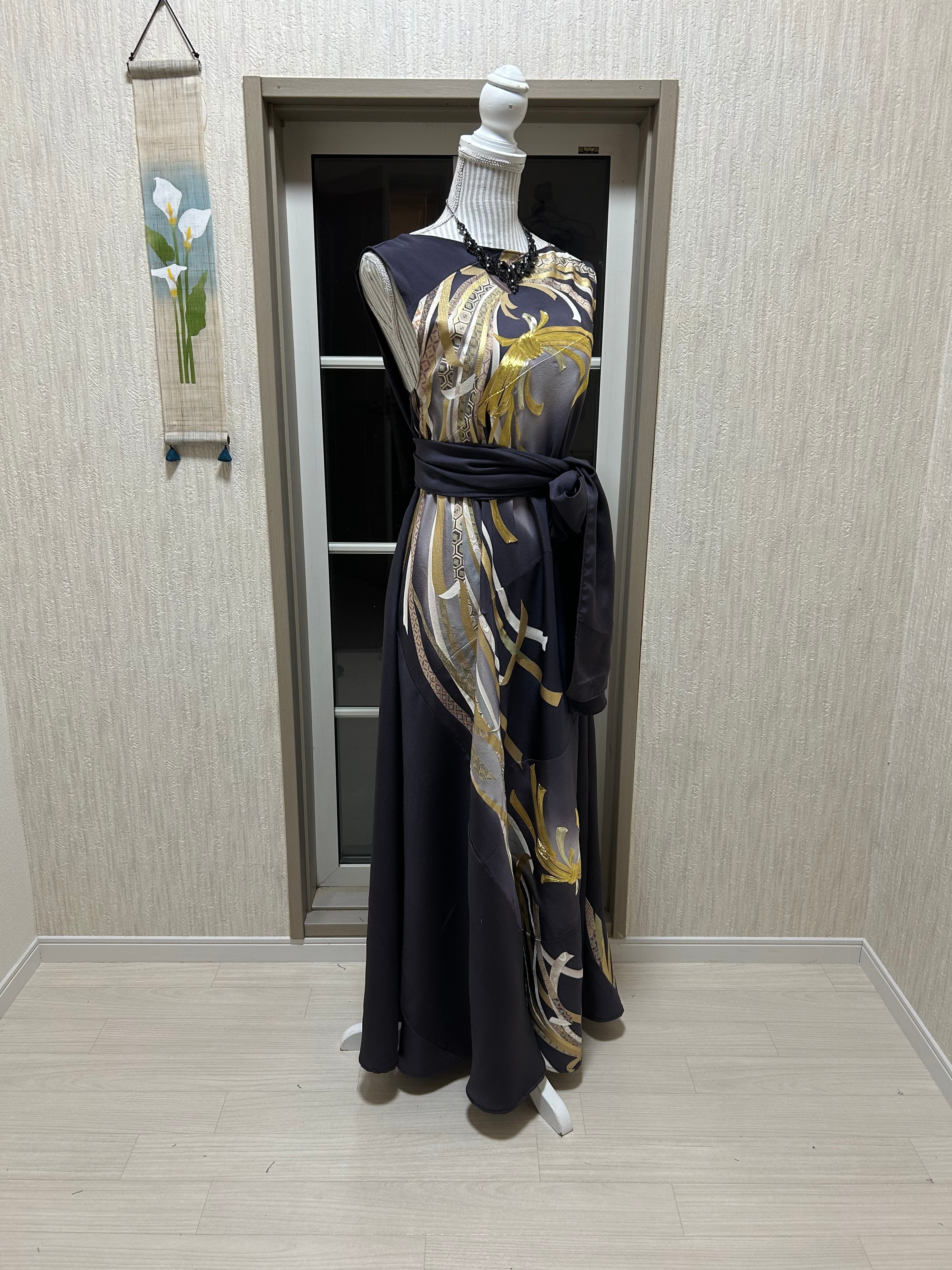 華やかな色留袖をリメイクしたアシンメトリーロングドレスが新登場です!美しいカラーリングと独特なデザインは、特別なお出かけやフォーマルシーンにぴったりです。エレガントでありながら遊び心を感じさせるスタイルをお楽しみいただけます。