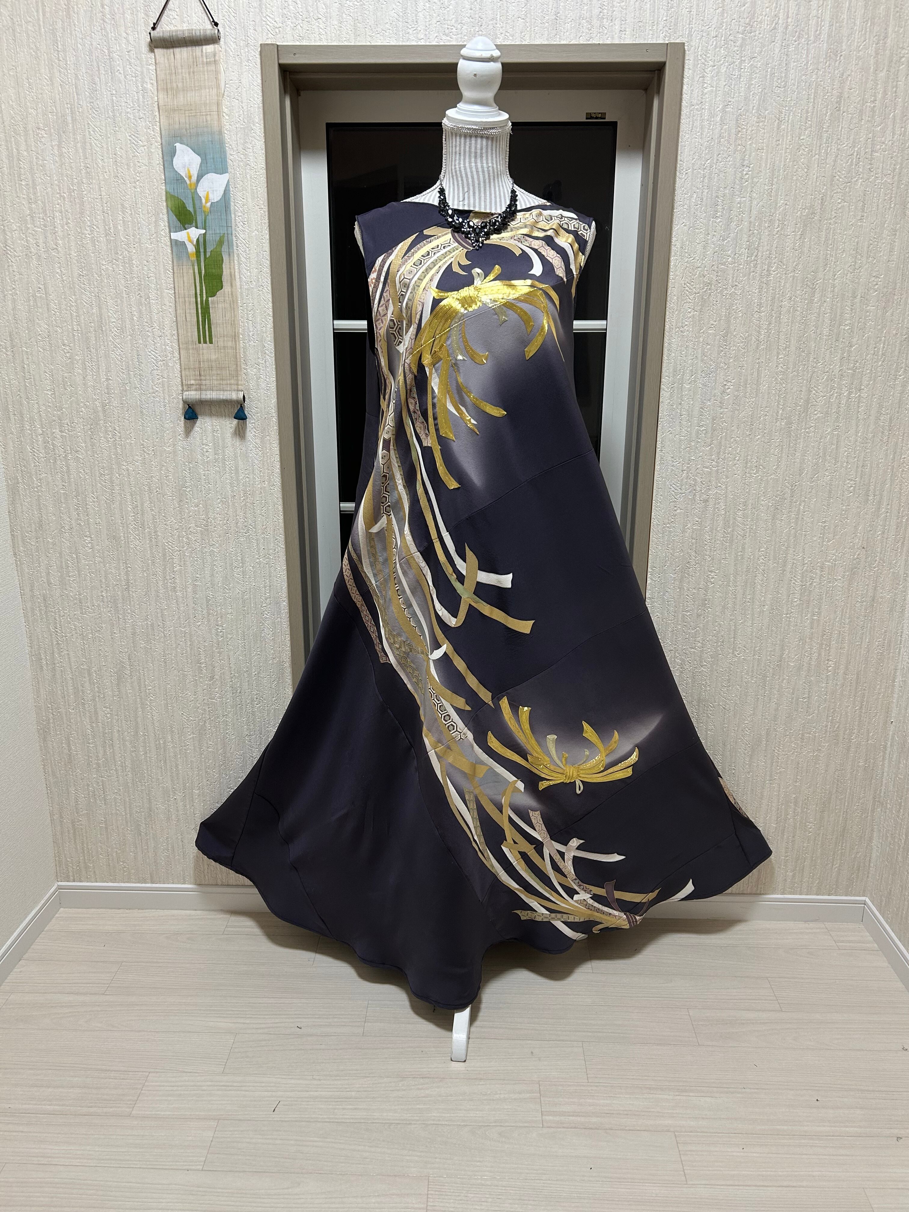 このロングドレスは、厳選された色留袖素材を活かしたリメイク作品です。伝統的な柄と現代的なシルエットの見事な融合により、他にはない特別感を生み出しています。日本の美意識を身近に感じながら、自分だけのスタイルを確立できる一着です。